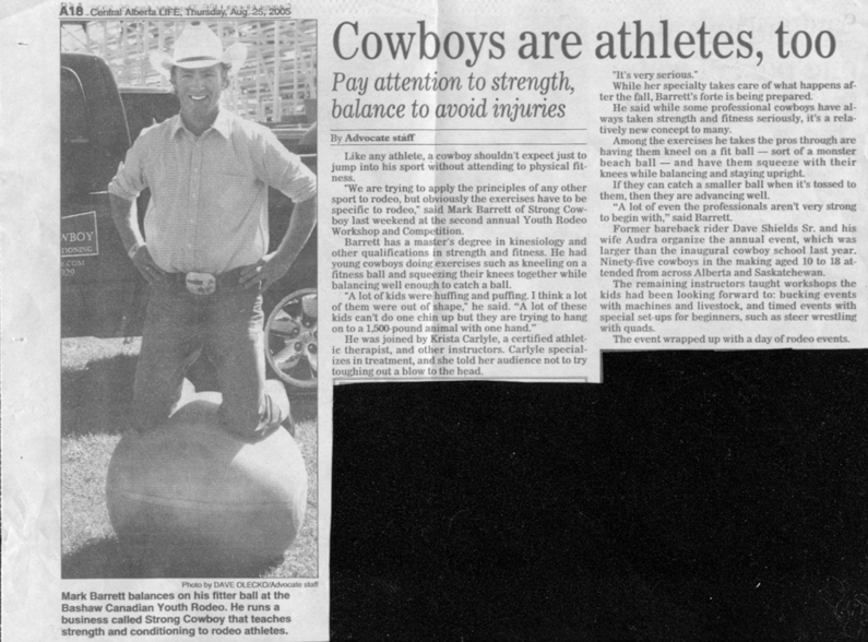 | Mark Barrett (with help from Dale Butterwick and Dr. D. Smith from the University of Calgary) published an article entitled 'Bull Riding: Analysis and Application of a Specific Strength and Conditioning Program'. The article describes the demands of bull riding and lists a full year's strength program for professional bull riders to follow. It appears in the June 2006 issue of the Strength and Conditioning Journal published by the National Strength and Conditioning Association (NSCA). Featured on the cover is Ian McKay (one of Mark's clients) riding 'Little Yellow Jacket', Vernal UT. |