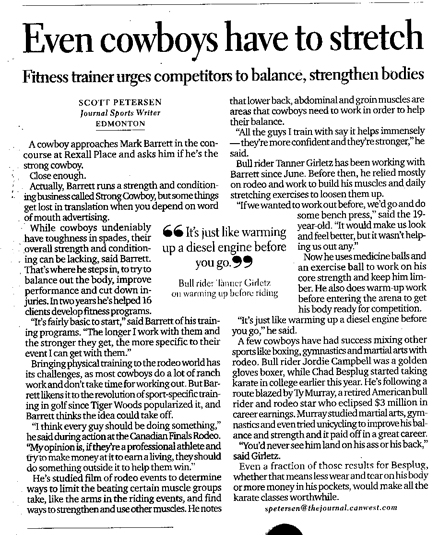 | Mark Barrett (with help from Dale Butterwick and Dr. D. Smith from the University of Calgary) published an article entitled 'Bull Riding: Analysis and Application of a Specific Strength and Conditioning Program'. The article describes the demands of bull riding and lists a full year's strength program for professional bull riders to follow. It appears in the June 2006 issue of the Strength and Conditioning Journal published by the National Strength and Conditioning Association (NSCA). Featured on the cover is Ian McKay (one of Mark's clients) riding 'Little Yellow Jacket', Vernal UT. |